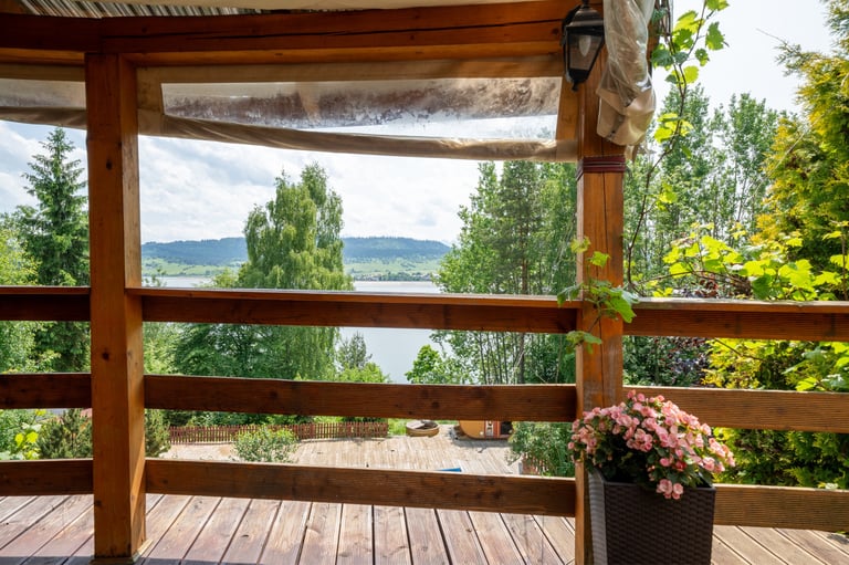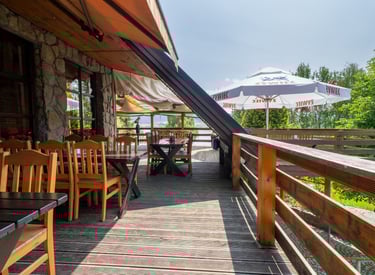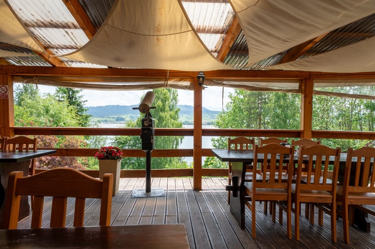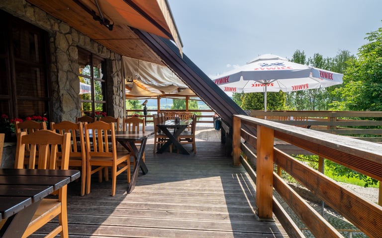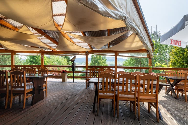 Zasmakuj w doskonałej kuchni w otoczeniu natury. Taras z widokiem na jezioro tworzy niepowtarzalny klimat.
